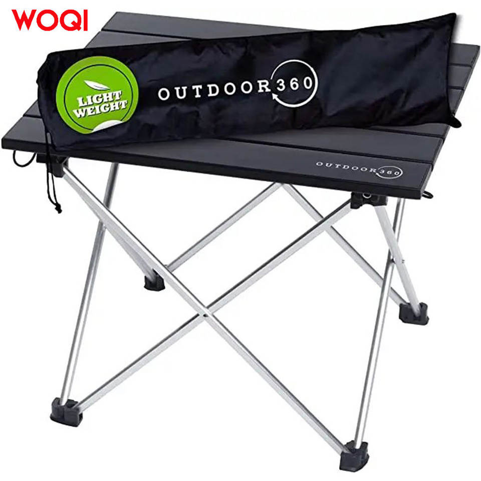 โต๊ะพับกลางแจ้ง Woqi โต๊ะอลูมิเนียมอัลลอยด์ทรงสี่เหลี่ยมแบบพกพาสำหรับตั้งแคมป์ปิ้งและบาร์บีคิว สีดำ