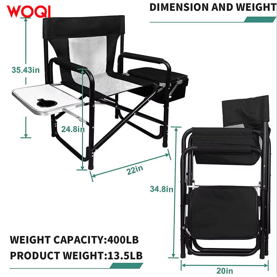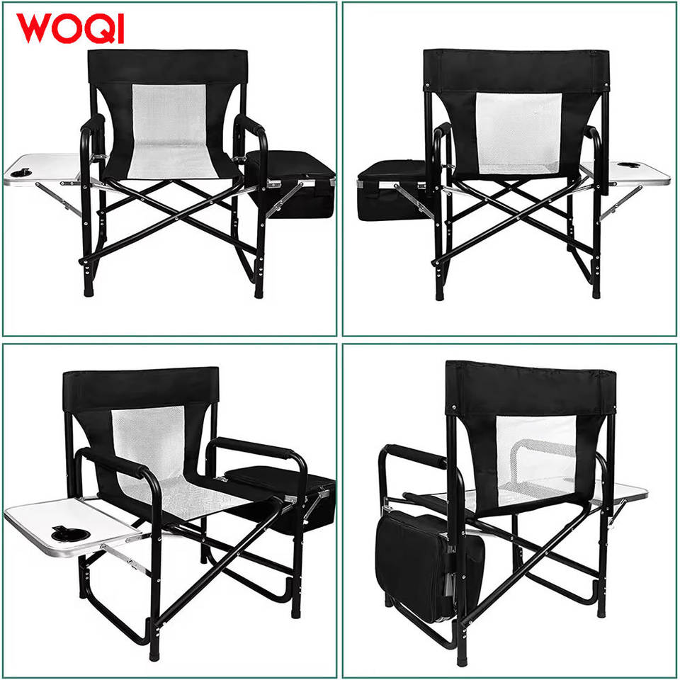 เก้าอี้พับสำหรับตั้งแคมป์พกพา Woqi พร้อมกระเป๋าเก็บความเย็นและช่องเก็บของแบบตาข่าย โครงอะลูมิเนียมพับได้ สีดำ