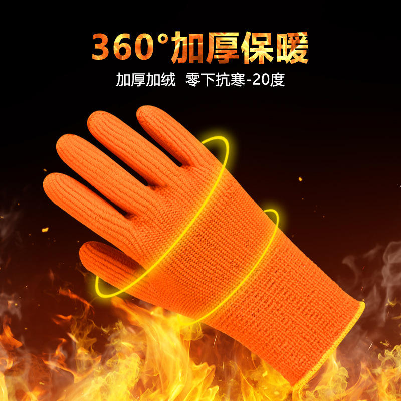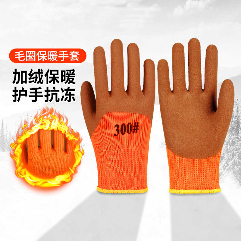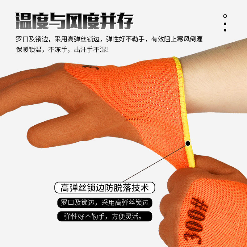 ถุงมือทำงานเคลือบยางฟูลเกรน 300 # ถุงมือป้องกันการเสียดสีเอนกประสงค์ 7 เข็ม แบบมีซับในขนแกะสีส้ม