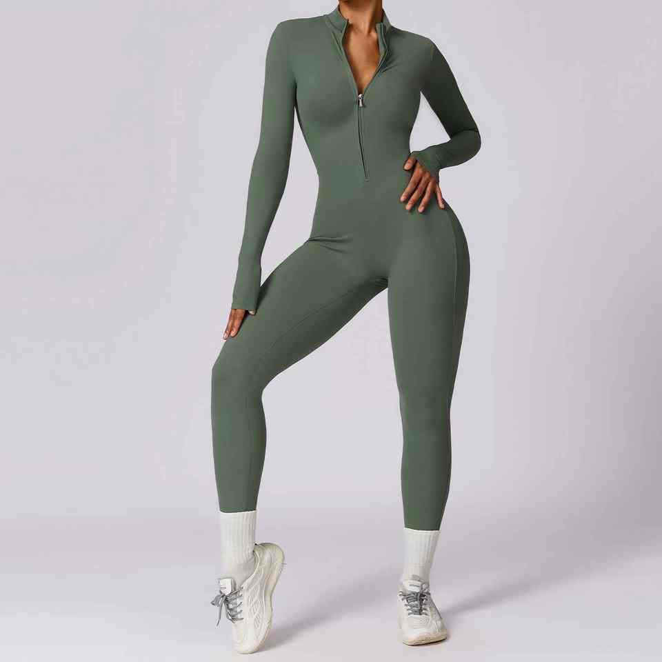 ชุดออกกำลังกายแบบชิ้นเดียวสำหรับผู้หญิง แขนยาว มีซิป พร้อมเลกกิ้งในตัว