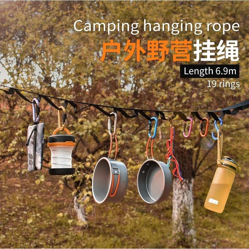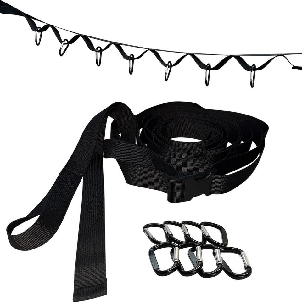 สายรัดเก็บของสำหรับเต็นท์ 19 ห่วง เชือกอ็อกซ์ฟอร์ดสีดำ ชุดสายรัดสำหรับตั้งแคมป์