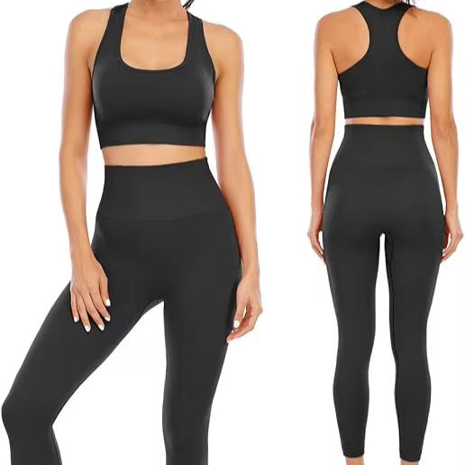 ชุดออกกำลังกายสตรี2ชิ้นเอวสูงไร้รอยต่อสายไขว้แบบไร้รอยต่อบรากีฬายืดได้เสริมฟองน้ำด้านหน้า