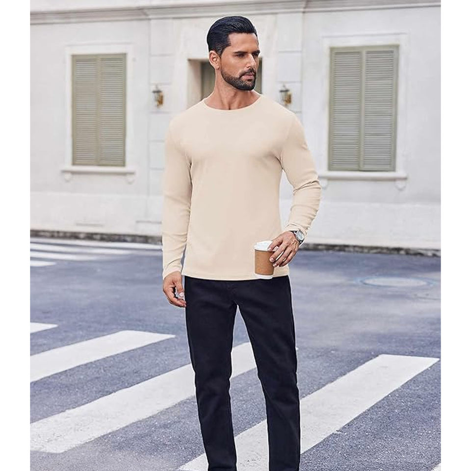 เสื้อวิ่งแขนยาวทรงหลวม คอวี น้ำหนัก 200 กรัม ผลิตจากโพลีเอสเตอร์/คอตตอน เสื้อยืดลำลองแฟชั่นสำหรับผู้ชาย ป้องกันการเป็นขุย