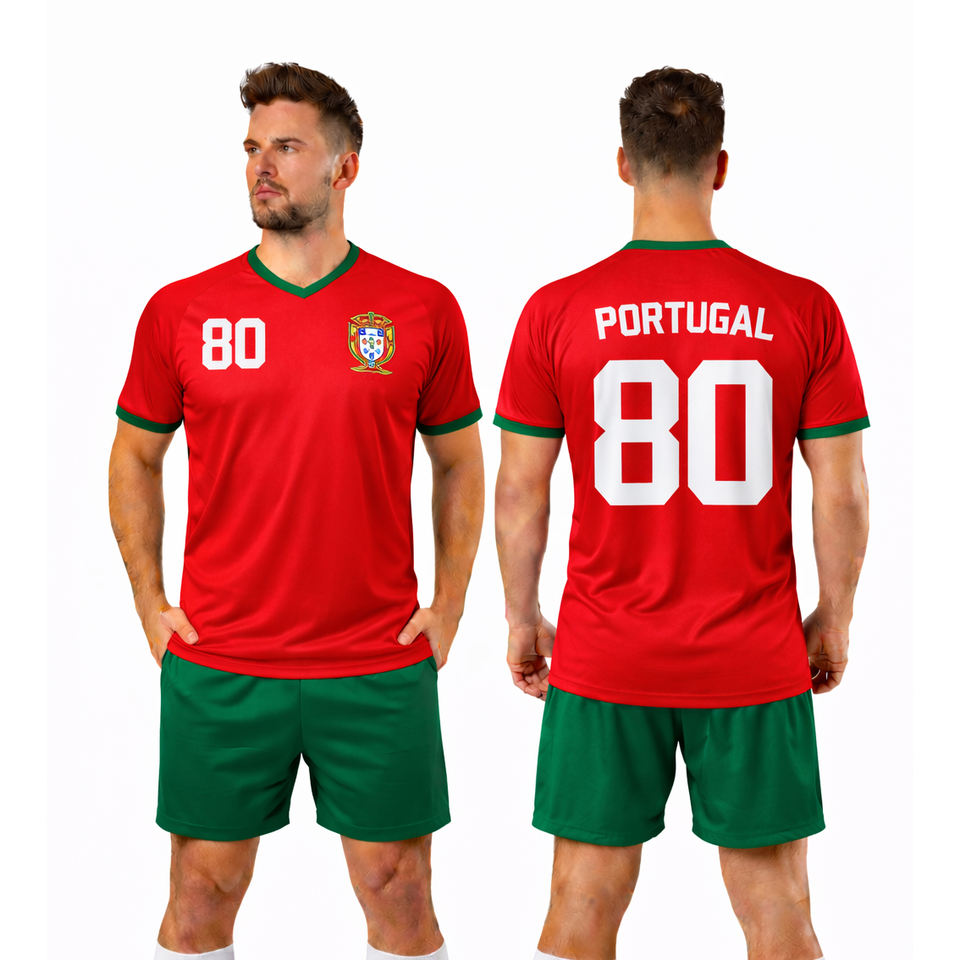 ชุดฟุตบอลโลก 2026 แบบกำหนดเอง สไตล์โปรตุเกส เสื้อฟุตบอลแขนสั้นสำหรับผู้ชายและผู้หญิง พร้อมกางเกงขาสั้น