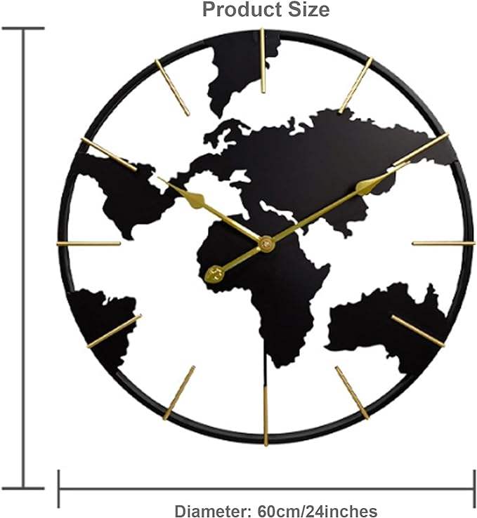 แผนที่โลก นาฬิกาแขวนทรงกลม นาฬิกาควอทซ์เคลือบผงคลาสสิกสีดําด้านเงียบไม่เคี้ยว