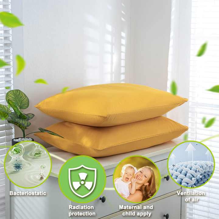ปลอกหมอนถักทอเนื้อแน่น ป้องกันไฟฟ้าสถิต ผลิตจากผ้าฝ้ายออร์แกนิกและเส้นใยเงิน ช่วยให้นอนหลับสนิท เหมาะสำหรับใช้ในโรงแรม โรงพยาบาล และที่บ้าน