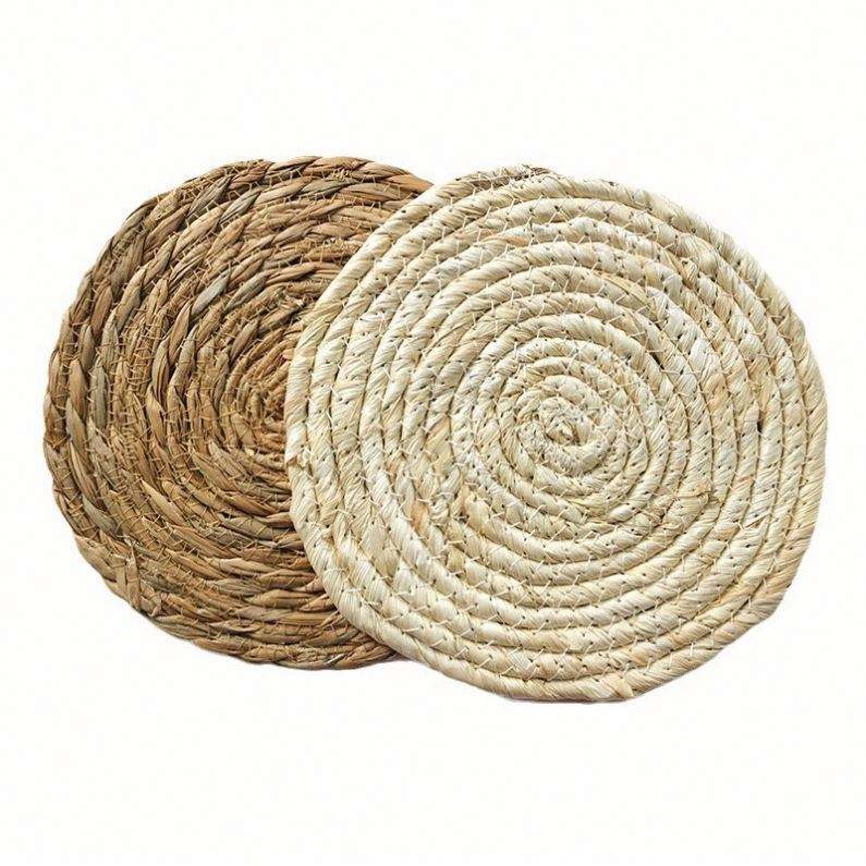 ชุดแผ่นรองจานสานแบบกำหนดเอง แผ่นรองโต๊ะทนความร้อน กันลื่น สีน้ำตาล แผ่นรองจานหวายทรงกลม