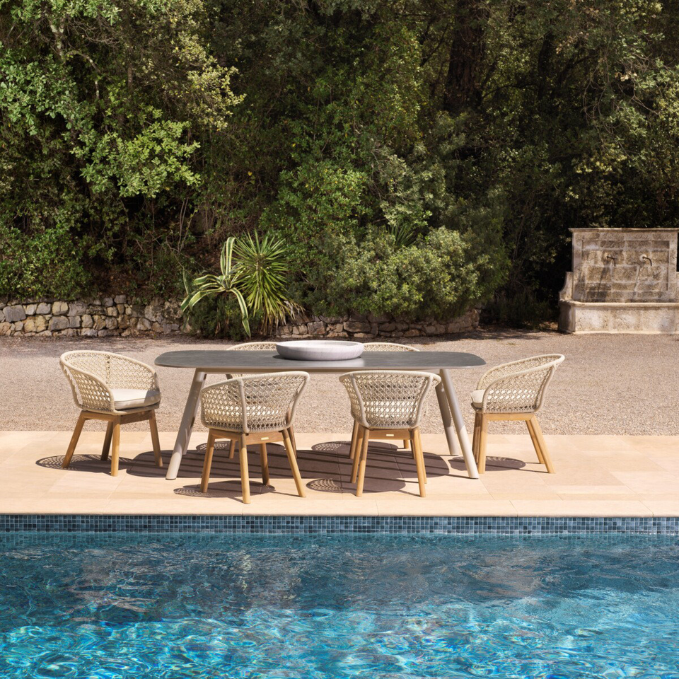 เก้าอี้รับประทานอาหารกลางแจ้งทำจากเชือกทอและไม้สัก