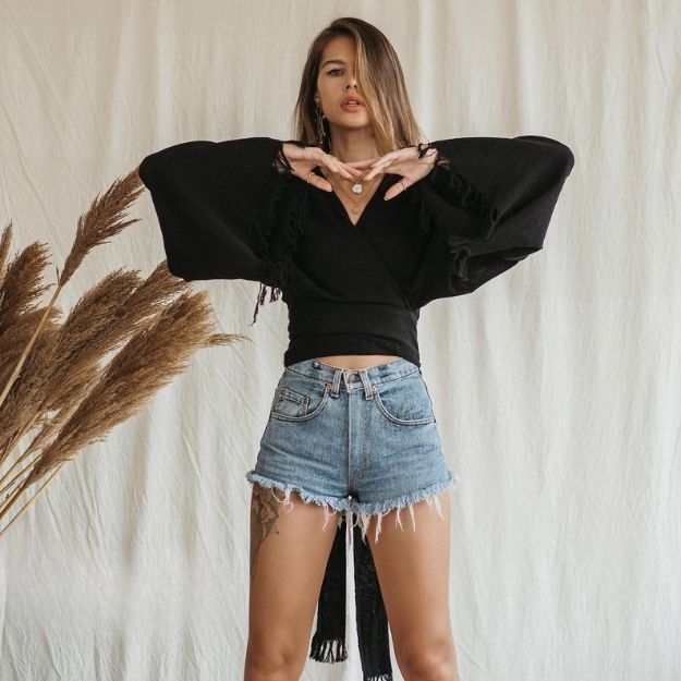 เสื้อคลุมกิโมโนผู้หญิงสไตล์โบฮีเมียน แขนกว้าง ทรงครอปท็อป ลายพิมพ์แบบชนเผ่า แต่งชายครุย เสื้อผ้าออร์แกนิค สีดำ ชุดสำหรับวันพักผ่อน