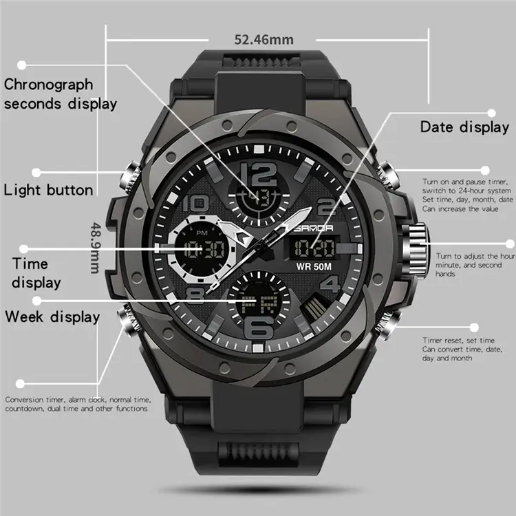 นาฬิกาข้อมือสไตล์ G สำหรับผู้ชาย นาฬิกาสปอร์ต ดีไซน์โดดเด่น ฟังก์ชั่นหลากหลาย จอแสดงผลคู่ LED ดิจิตอล อิเล็กทรอนิกส์ นาฬิกาสปอร์ตญี่ปุ่น กันน้ำ รับผลิตแบบ OEM