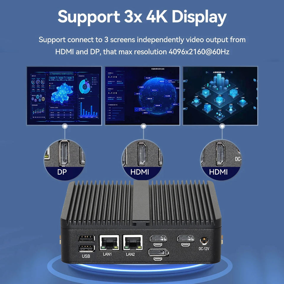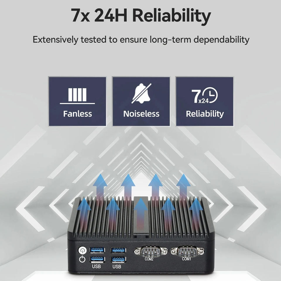 คอมพิวเตอร์อุตสาหกรรมขนาดเล็ก XCY In-tel N150 แบบไร้พัดลม รองรับ IoT พร้อมพอร์ต Serial 2 ช่อง RS232, พอร์ต Ethernet 2 ช่อง, พอร์ต H-DMI 2 ช่อง, พอร์ต DP 1 ช่อง, พอร์ต USB 6 ช่อง, WiFi, โมเด็ม 4G, รองรับ Windows 11 หรือ 10