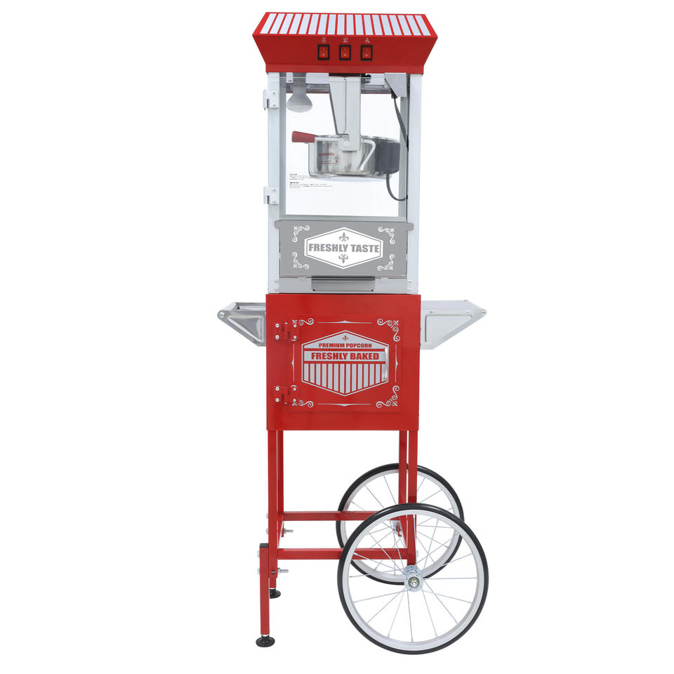 เครื่องทำป๊อปคอร์นแบบโรงภาพยนตร์ รุ่น XH-P831 พร้อมรถเข็นและหม้อขนาด 12 ออนซ์ - สีแดง สไตล์วินเทจ ติดล้อ