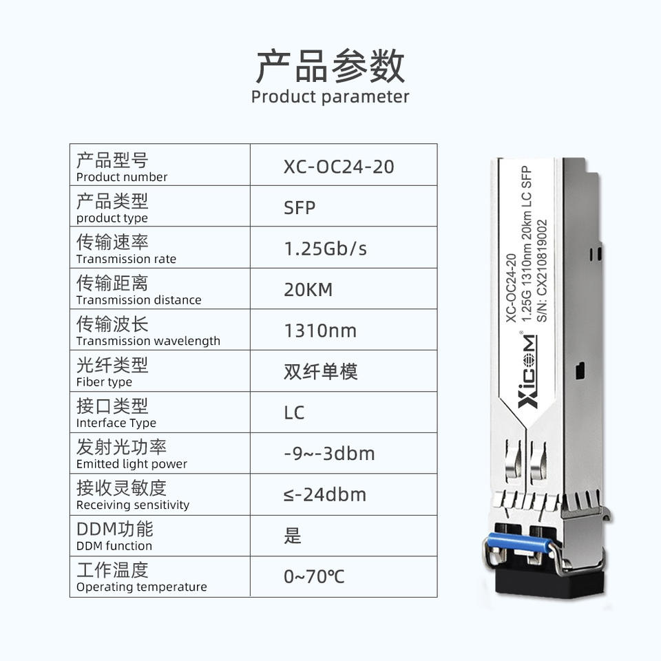 โมดูล SFP xicom 1.25G 1310nm ตัวรับส่งสัญญาณไฟเบอร์ออปติกโหมดเดียว20km LC สำหรับสาย LAN