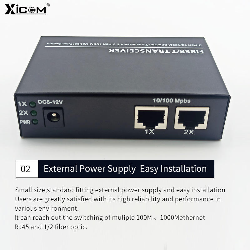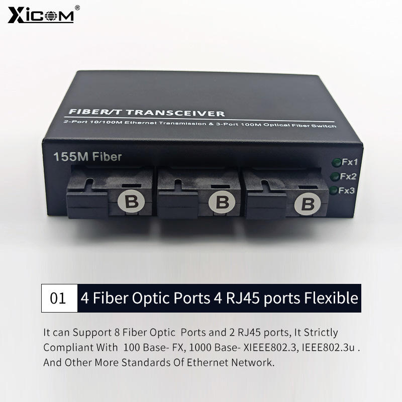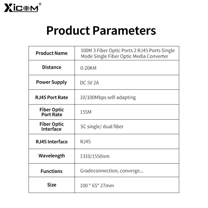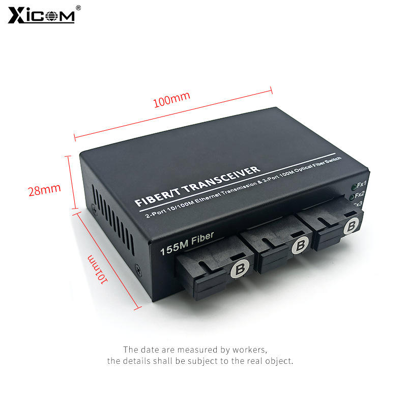 ตัวแปลงสัญญาณไฟเบอร์ออปติก XICOM 100M 3 พอร์ตออปติคอล 2 พอร์ต RJ45 โหมดเดี่ยว SC 1310/1550nm ระยะทาง 20 กม.
