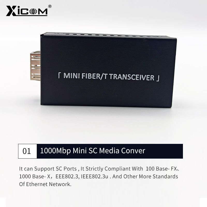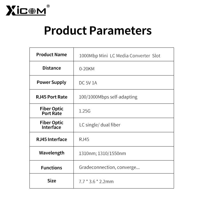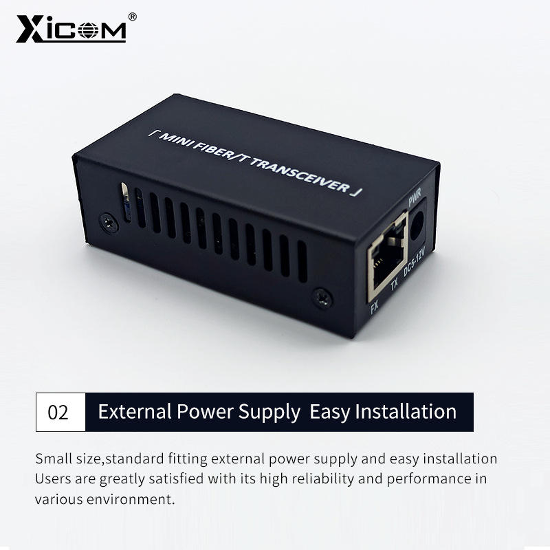 ตัวรับส่งสัญญาณไฟเบอร์ออปติก XICOM รุ่นมินิ LC โหมดเดี่ยว ระยะ 20 กม. พอร์ต RJ45 ใช้พลังงาน DC 5V