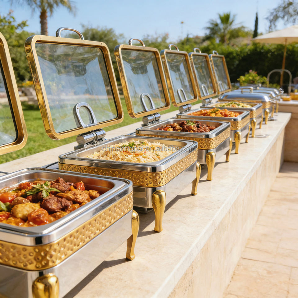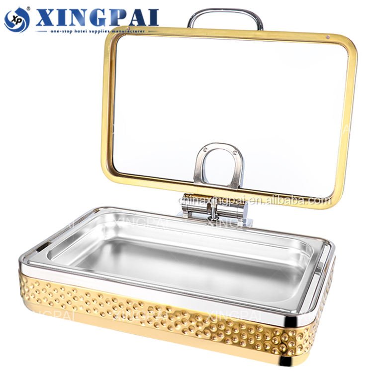 XINGPAI ชุดเครื่องอุ่นอาหารสเตนเลสสตีล,ทรงสี่เหลี่ยมผืนผ้าสีทองสำหรับโรงแรมระดับห้าดาวพร้อมฝาแก้วมองเห็นได้