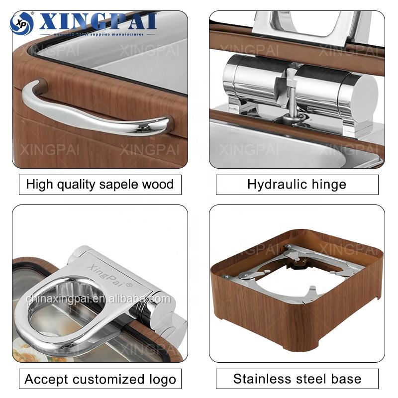 Xingpai อุปกรณ์สำหรับร้านอาหารของโรงแรม Sapele ที่อุ่นอาหารทรงสี่เหลี่ยมผืนผ้าขนาดเล็กสำหรับบุฟเฟต์4L ปรุงอาหารที่มีฝาแก้ว