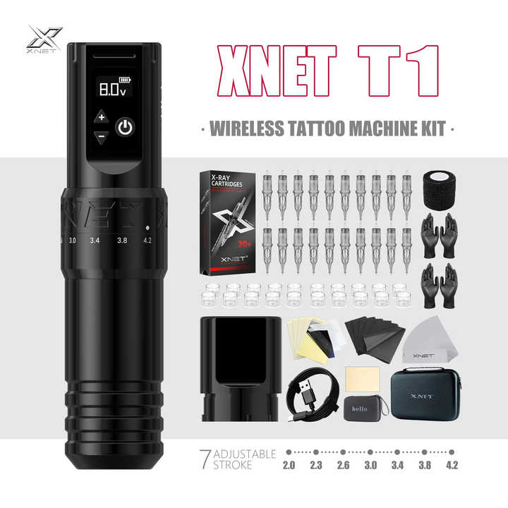 เครื่องสักไร้สาย XNET T1 พร้อมชุดอุปกรณ์ครบชุด ปรับระดับความยาวได้ มอเตอร์แบบกำหนดเอง ปากกาสำหรับสักลาย พร้อมตลับหมึก 20 ชิ้น สำหรับงานศิลปะการสัก
