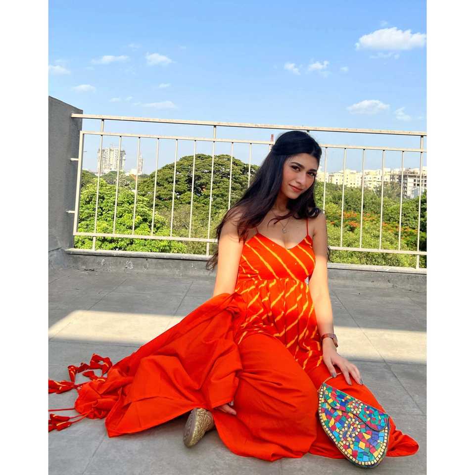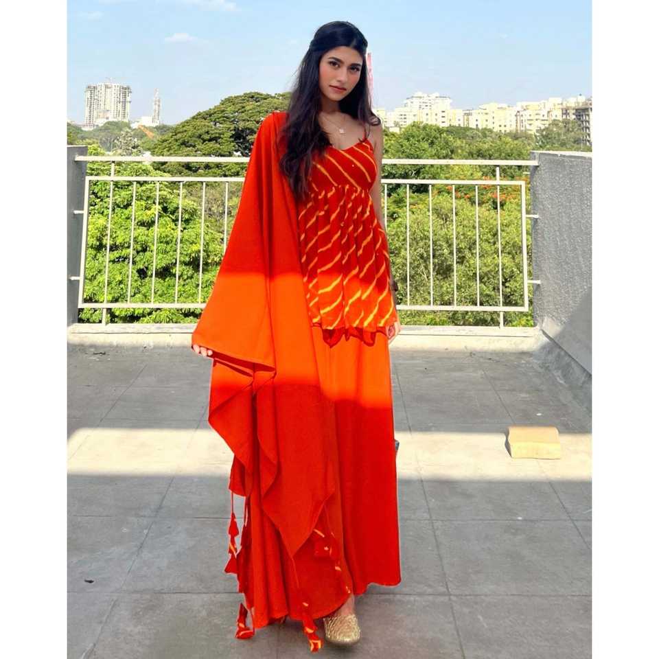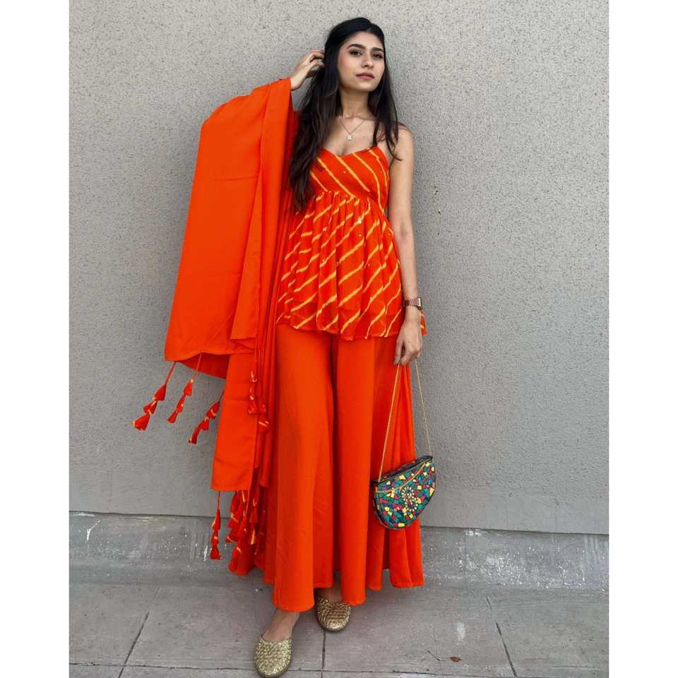 XS Size Orange Chiffon Spaghetti Leheriya Suit Set