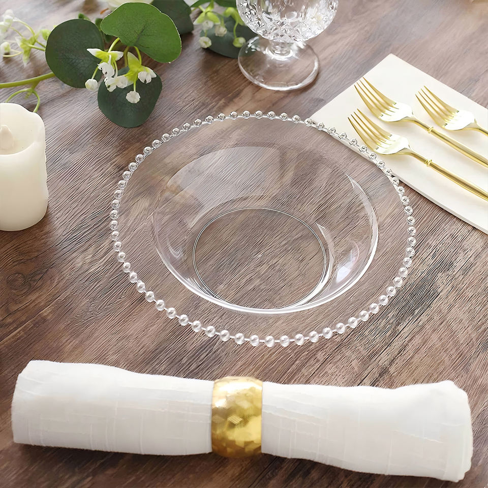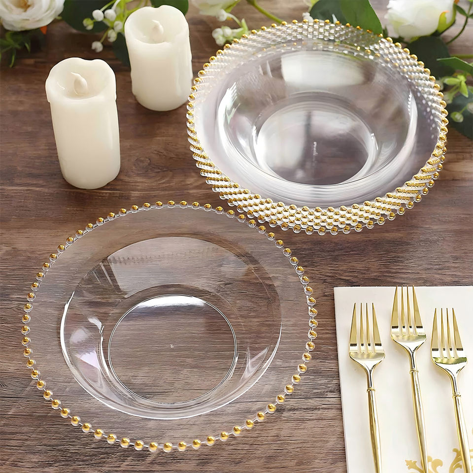 Xueli ชามพลาสติก PS ใช้ซ้ำได้พร้อมขอบลูกปัดมุกและฟอยล์สีทอง/เงินสำหรับตกแต่งชามแบบใช้แล้วทิ้งที่หรูหรา