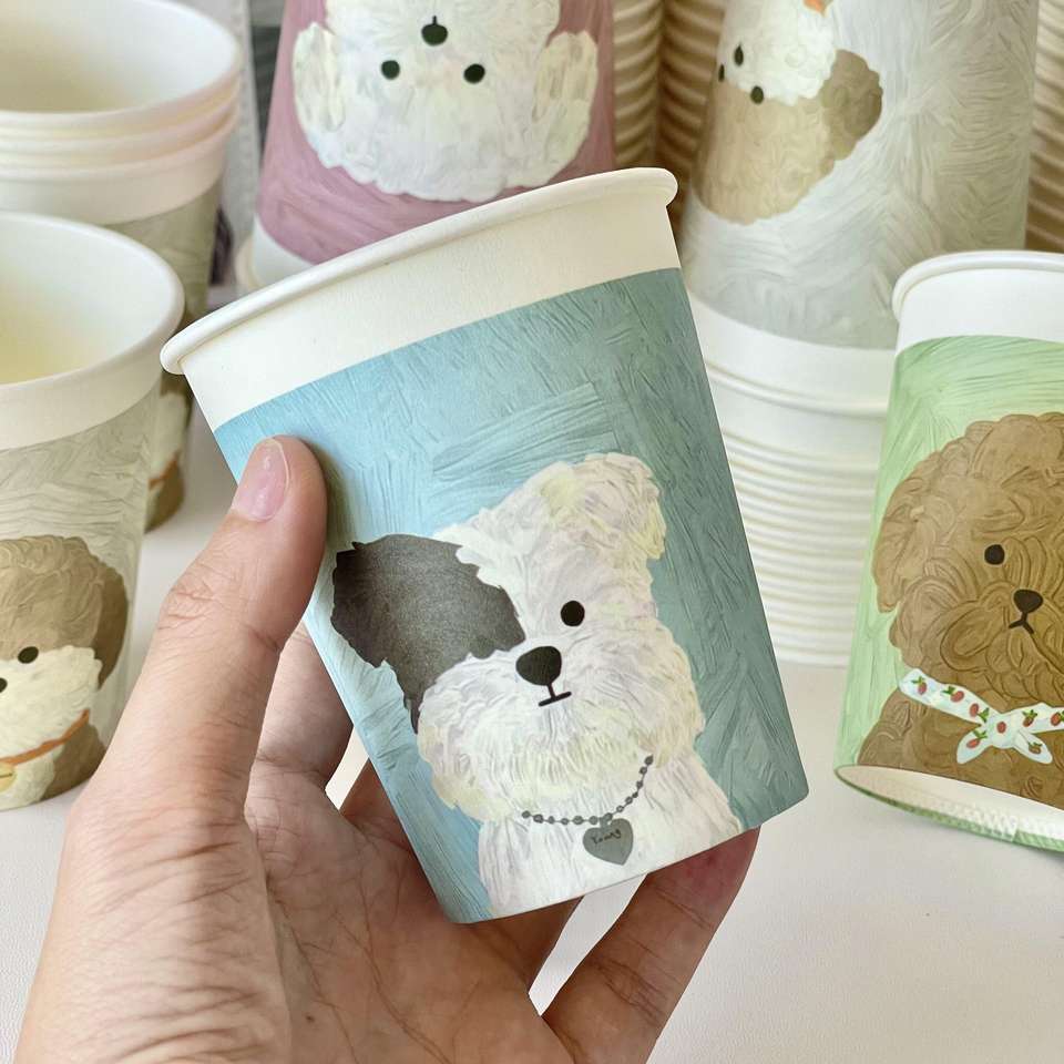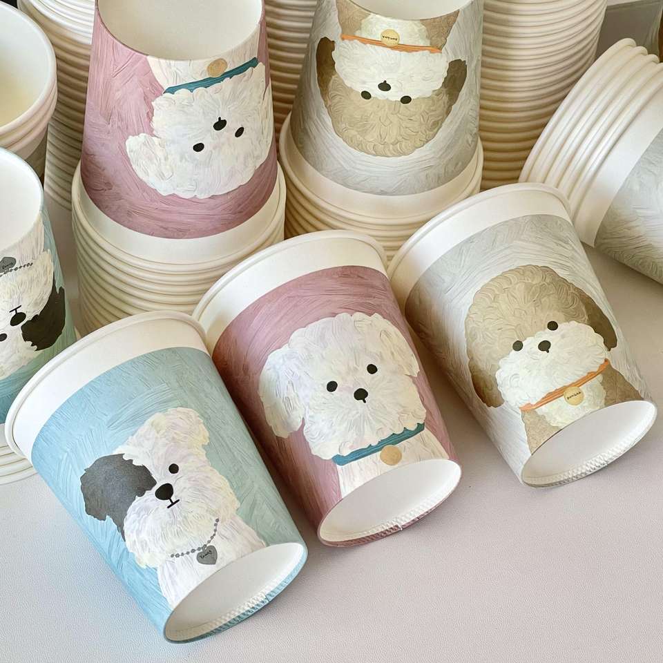 แก้วกาแฟกระดาษแบบใช้ครั้งเดียวขนาด 10 ออนซ์ จากเซียะเหมิน ลายสุนัขเพ้นท์สีน้ำมัน แบบหนาและแข็งแรง เหมาะสำหรับงานเทศกาลและใช้เสิร์ฟแขก