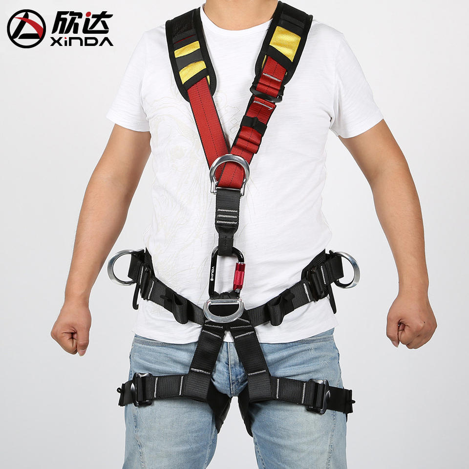 สายรัดนิรภัยสำหรับปีนหน้าผาซินด้า สายรัดไหล่โพลีเอสเตอร์แบบปรับได้พร้อมวงแหวนรูปตัว D สแตนเลส รับน้ำหนักได้สูง