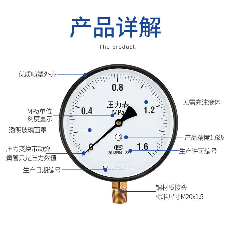 เกจวัดแรงดันมาตรฐานทองเหลือง Y-150 0-1.6 2.5 40 60 เมกะปาสคาล สำหรับหม้อไอน้ำ ขนาดเส้นผ่านศูนย์กลางเข็ม 100 มม. สำหรับแรงดันไฮดรอลิก/แก๊ส