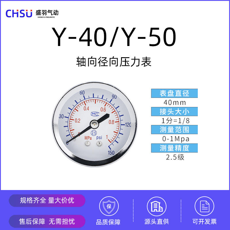 เกจวัดแรงดันแกน Y-40 ขนาด 1/8 นิ้ว เกจวัดแบบกลไกสำหรับกระบอกลม ตัวประมวลผลลม Y-50 เกจวัดแรงดันน้ำแบบไร้ขอบ