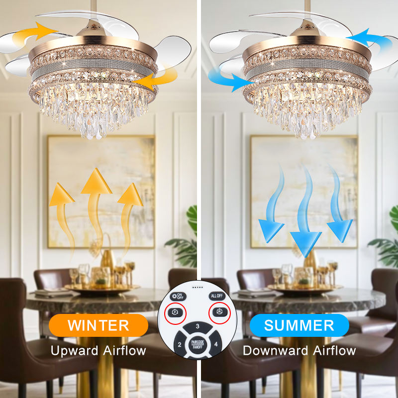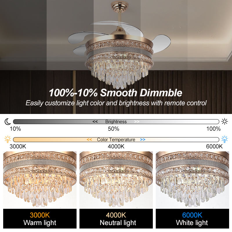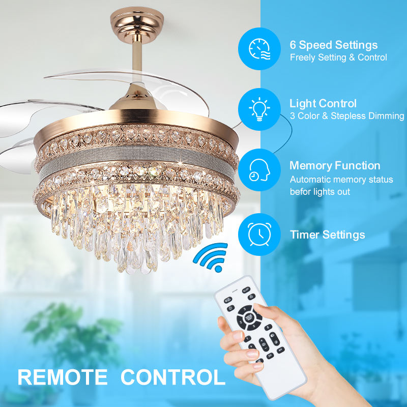 พัดลมเพดานคริสตัลยุโรป Y126ไฟพัดลมติดเพดานโคมระย้าไฟพัดลมติดเพดาน LED สีทองหรูหราและรีโมทคอนโทรล