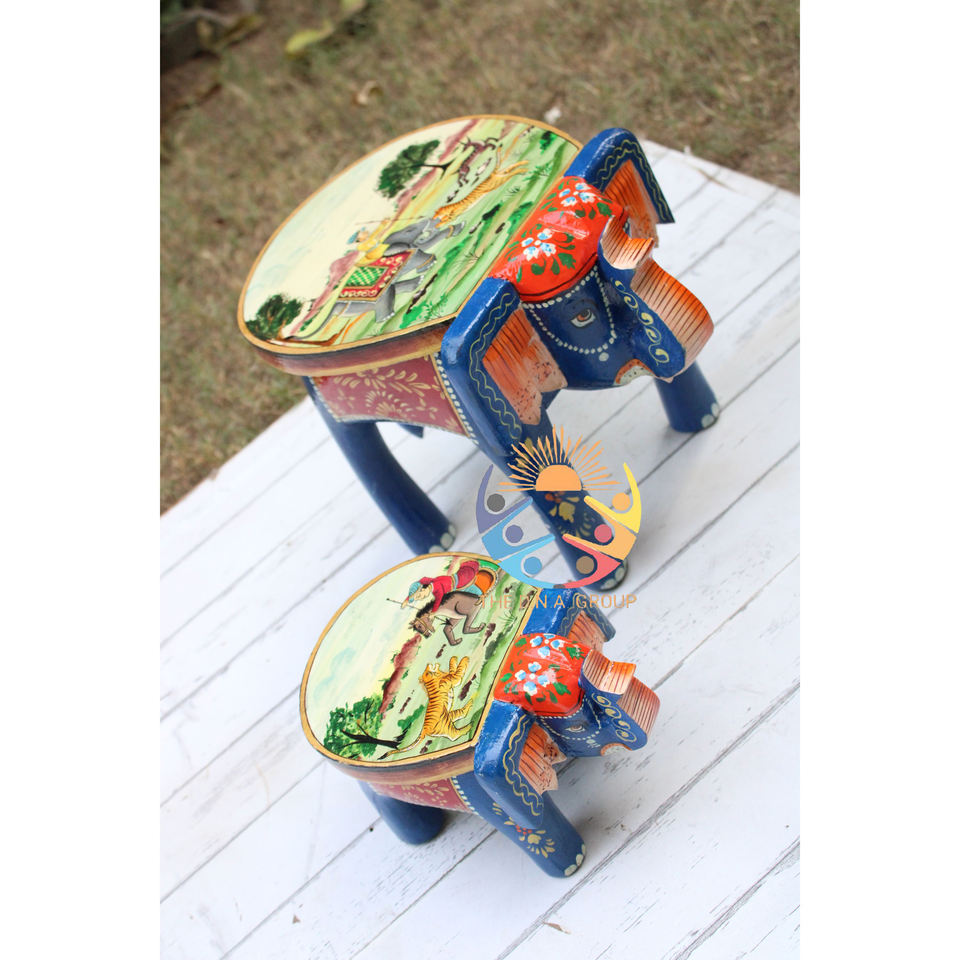 Handcrafted Wooden Elephant Stool Set with Rajasthani Hand Painting
