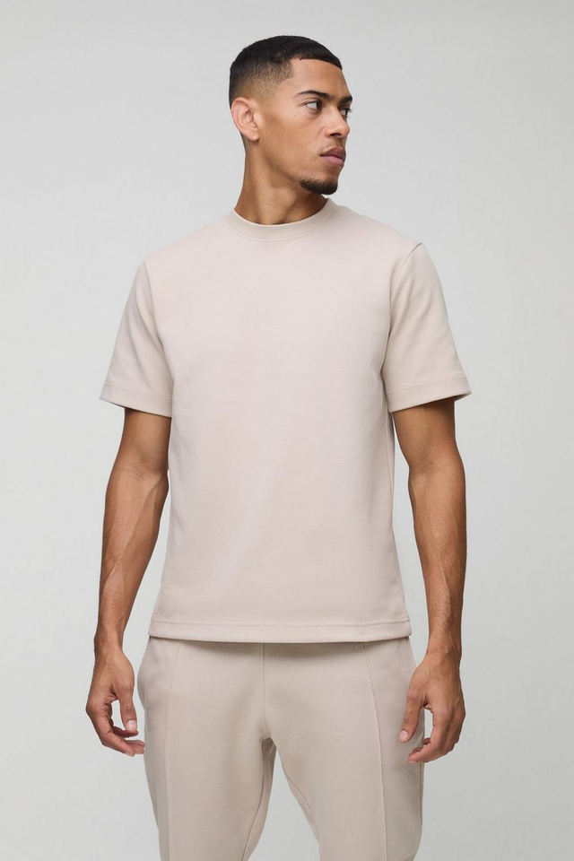 ชุดสองชิ้นลำลองเสื้อยืดคอกลมแขนสั้นสำหรับผู้ชาย Y2K สีเบจแบบมินิมอลและกางเกงวิ่งทรงสลิมฟิตพร้อมรูปแบบที่เข้ากัน