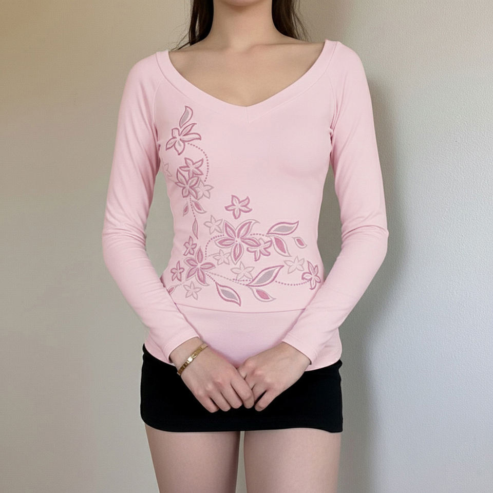 เสื้อยืดแขนยาวลายดอกไม้สไตล์วินเทจ Y2K น่ารักสำหรับผู้หญิง เรียบง่าย หวาน สีชมพู คอวี ทรงเข้ารูป เป็นมิตรกับสิ่งแวดล้อม สวมใส่สบาย