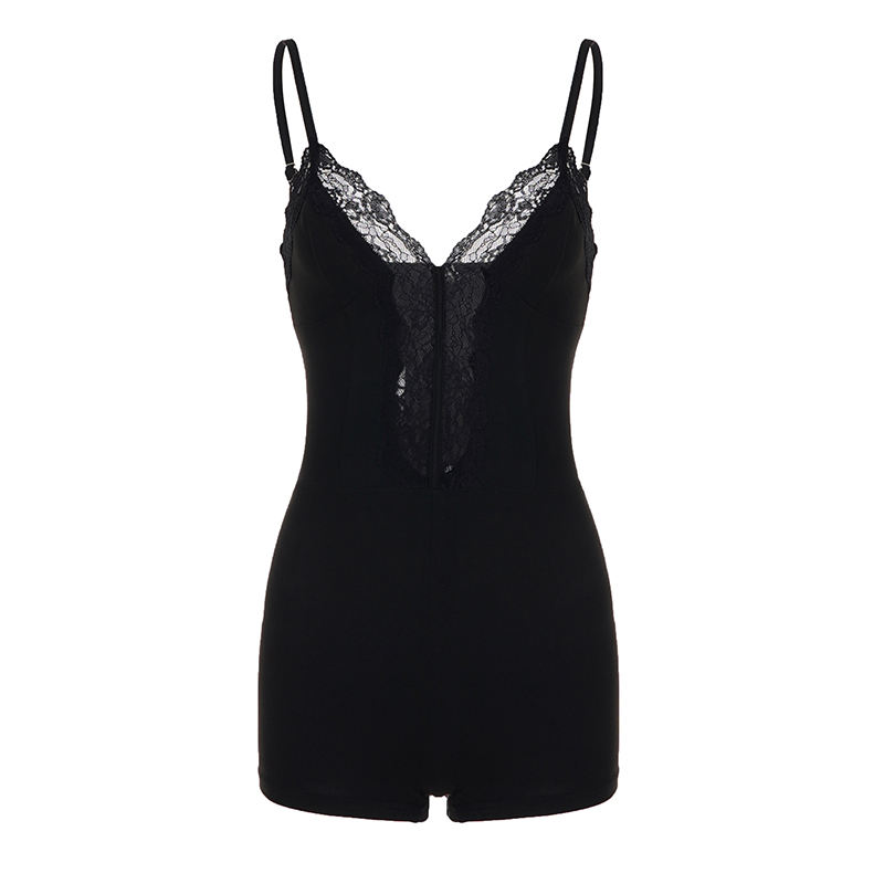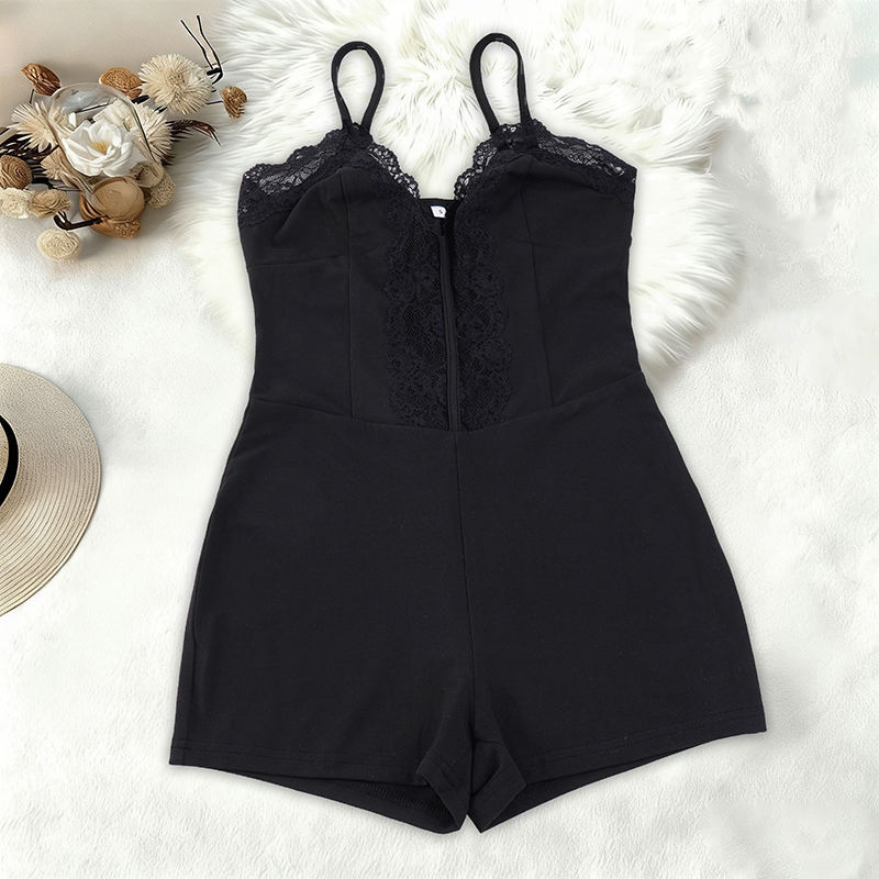 แฟชั่นโยคะฤดูร้อนสไตล์ Y2K ชุดรอมเปอร์ขาสั้นคอวีเซ็กซี่ ผ้าเนื้อยืดเข้ารูป ไหล่เดี่ยว แต่งผ้าลูกไม้ถักแบบวอชด์