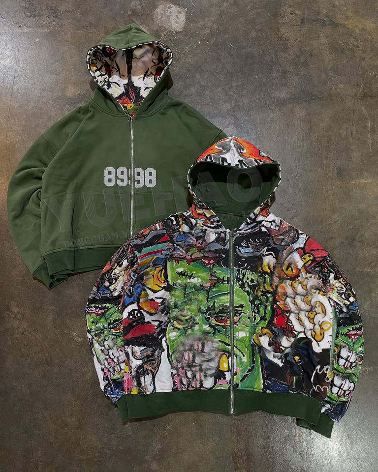 เสื้อฮู้ดดี้ Y2K แบบ OEM สั่งทำพิเศษ ทรงหลวม ซิปหน้า ผ้าฝ้าย 400GSM พิมพ์ลายกราฟฟิตีทั่วตัว แบบซับลิเมชั่น ทรงโอเวอร์ไซส์ ลายอนิเมะ สำหรับผู้ชาย