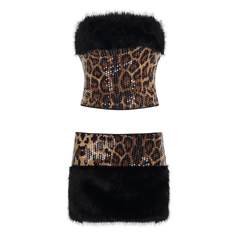 ชุดเซ็ตสองชิ้นลายเสือดาวสไตล์วินเทจสุดฮิต Y2K ความยาวเหนือเข่า แต่งเลื่อมและขนนก สำหรับฤดูใบไม้ผลิ/ฤดูร้อน
