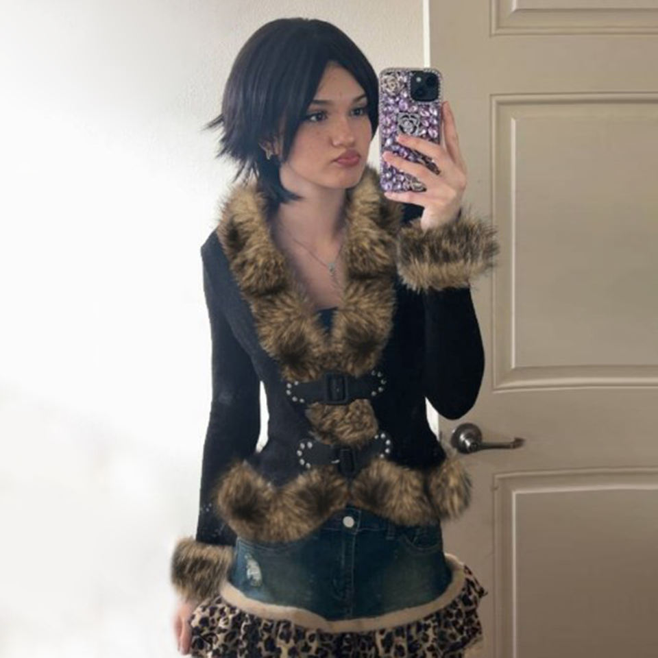 เสื้อแจ็คเก็ตคาร์ดิแกนคอขนสไตล์ย้อนยุค Y2K พร้อมกระดุมหนัง ดีไซน์รัดเอว สไตล์ลำลองแนวสตรีทสำหรับการแต่งตัวหลากหลาย