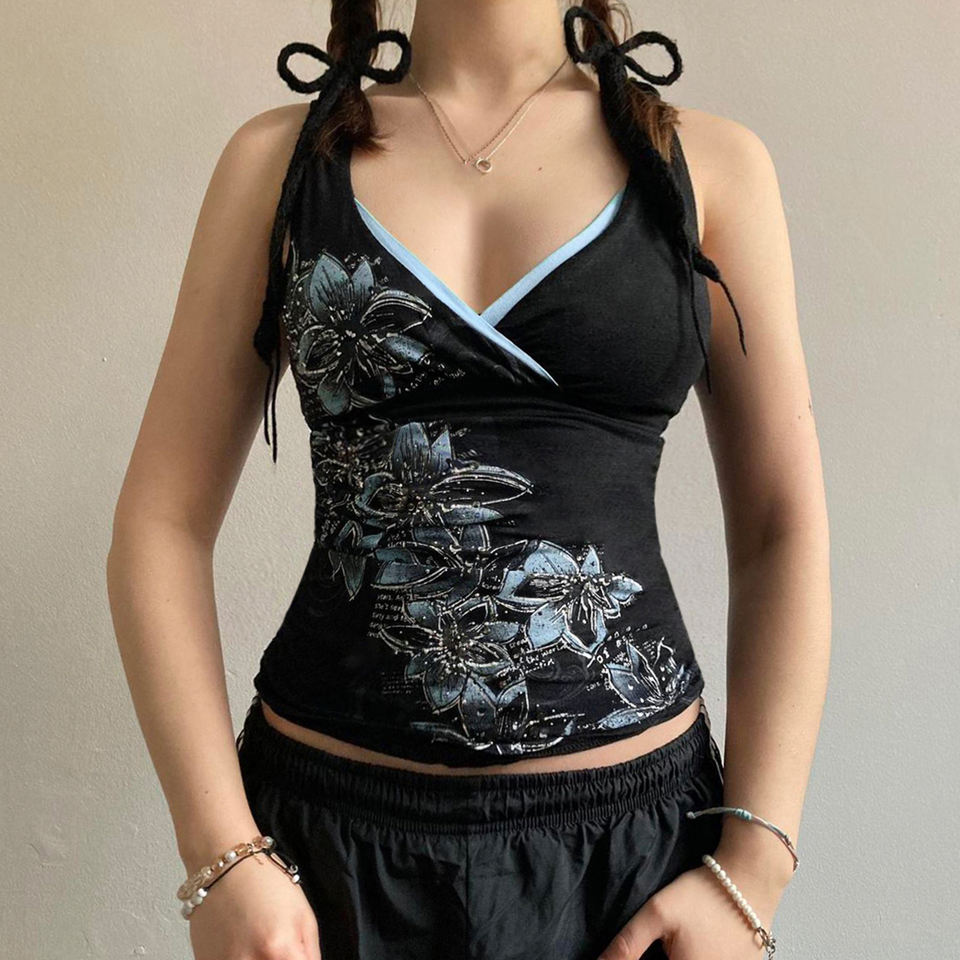Y2K Revival เสื้อ CAMIS ผ้าถักพิมพ์ลายดอกไม้เซ็กซี่ ระบายอากาศได้ดี คอวี แต่งขอบตัดกันและทรงโดดเด่น