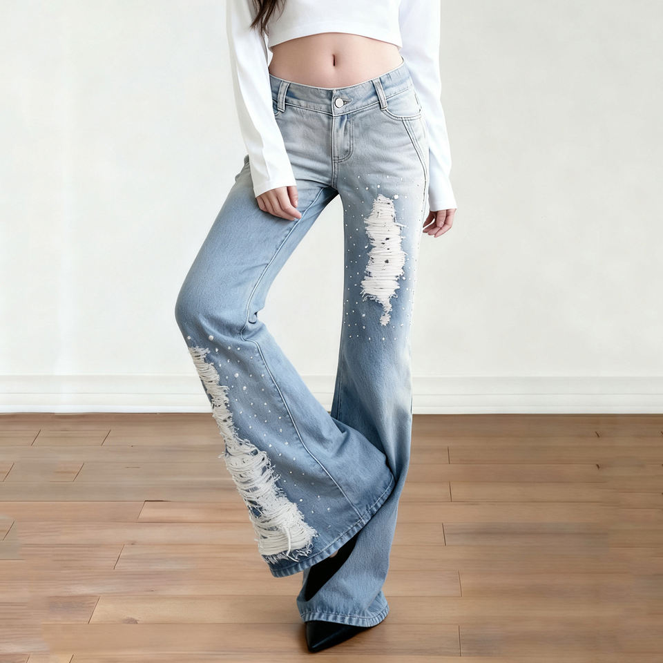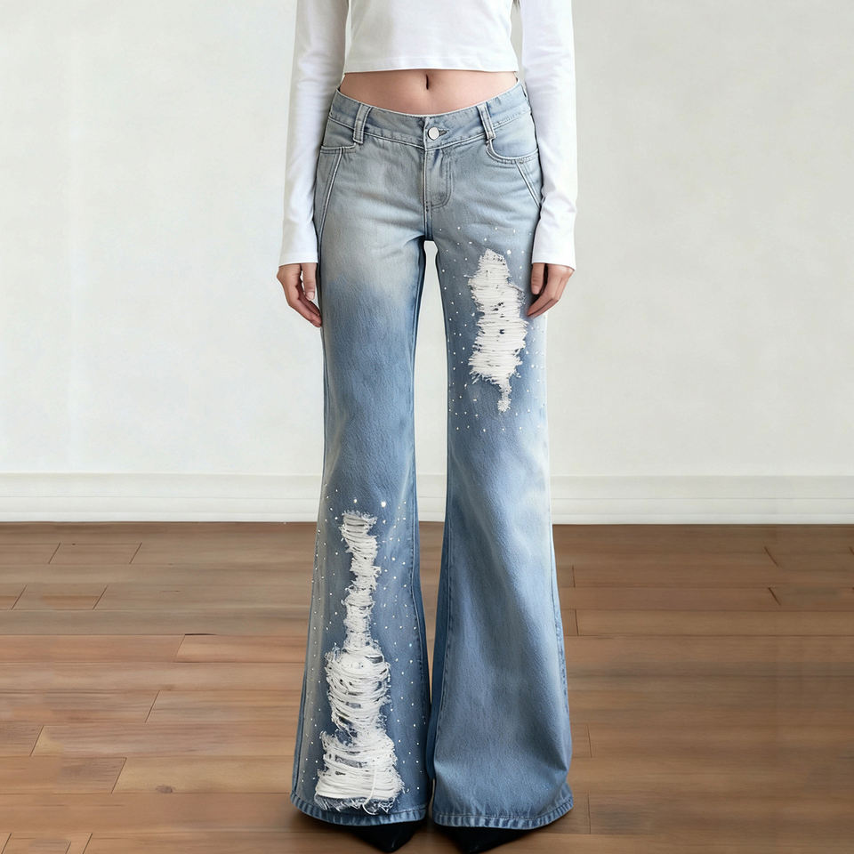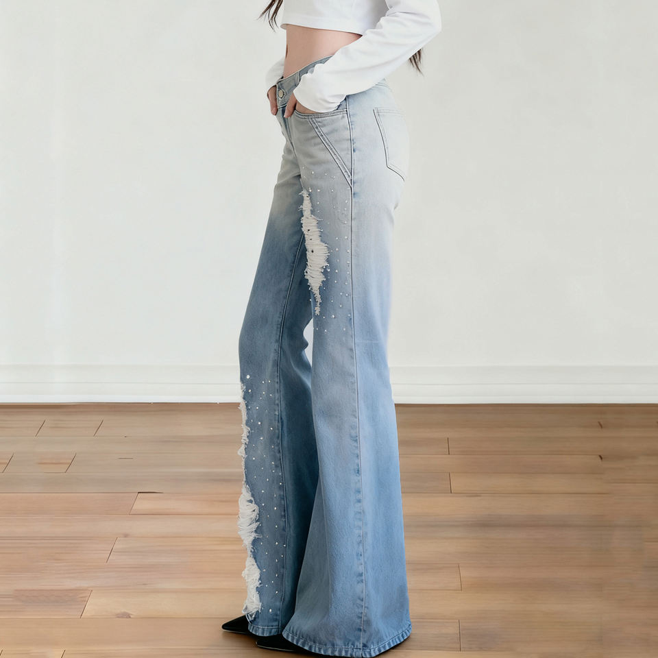 กางเกงยีนส์เดนิมทรงขาบานเอวสูงแต่งลายฉลุปักเลื่อมสไตล์วายทูเค แต่งขอบเอววี แต่งผ้าลูกไม้ แต่งรอยขาดไล่เฉดสี
