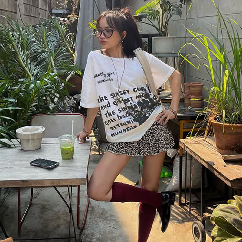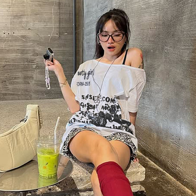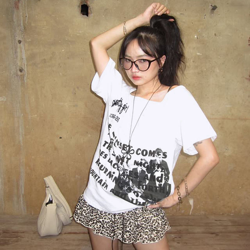 เสื้อยืดสไตล์ Y2K พิมพ์ลายตัวอักษร ทรงหลวม คอเฉียงแบบไม่สมมาตร โชว์ไหล่ สาวฮอต ดูดี มีสไตล์ ลำลอง หวาน เซ็กซี่