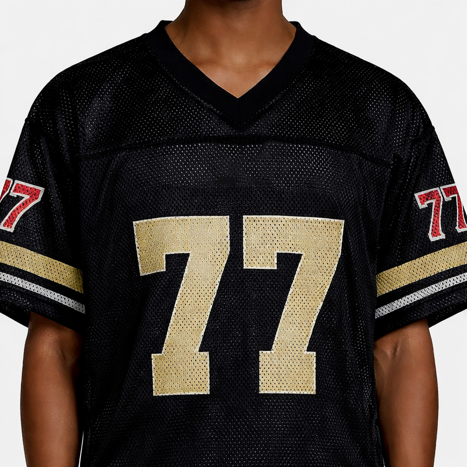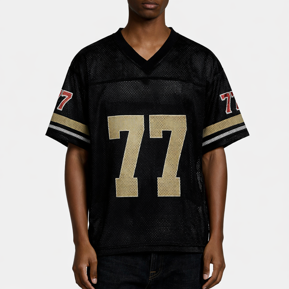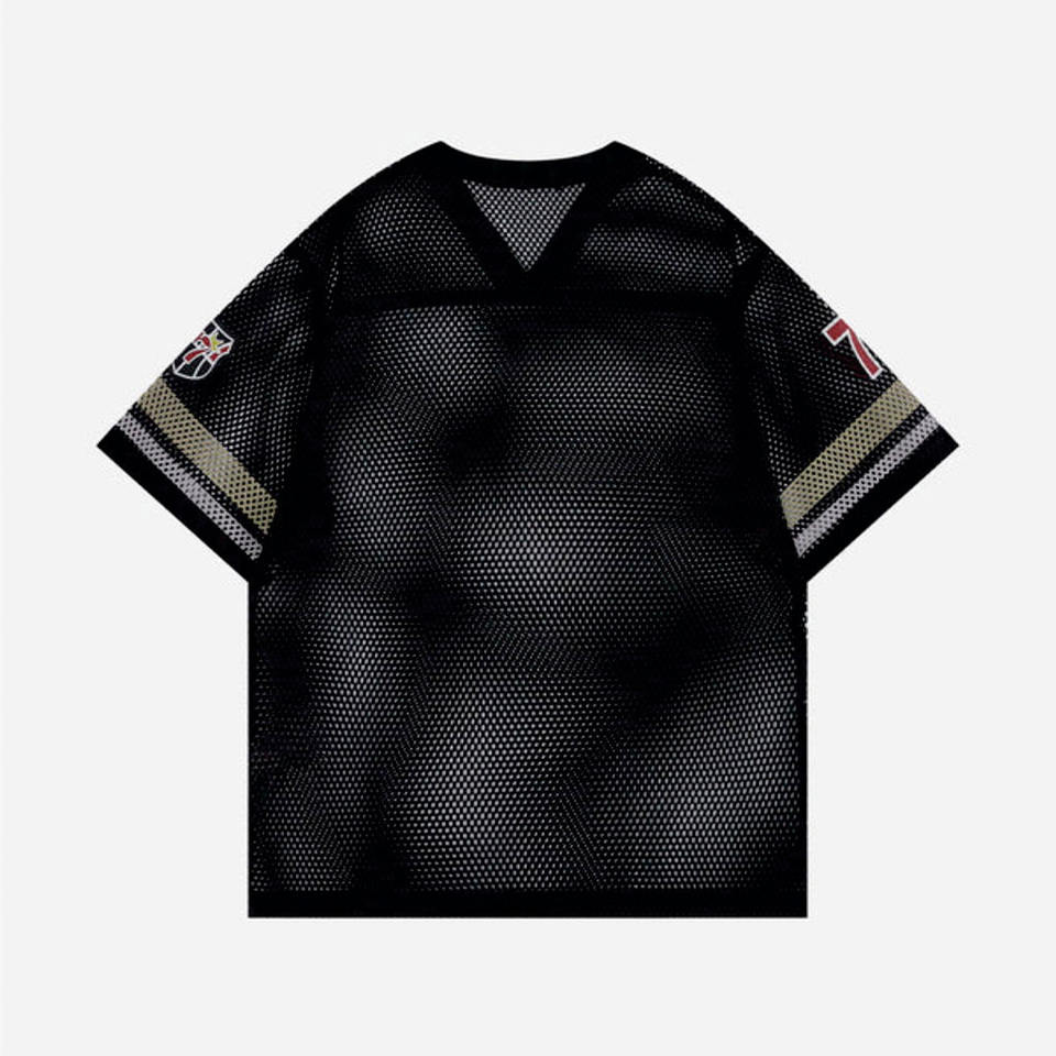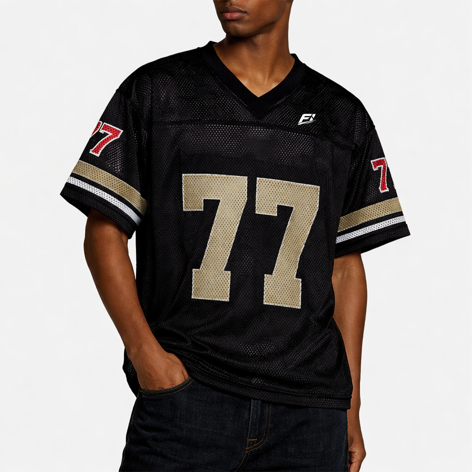 เสื้อฟุตบอลอเมริกันแบบตาข่ายสั่งทำสไตล์ Y2K สำหรับผู้ชาย เนื้อผ้าโพลีเอสเตอร์ระบายอากาศ คอวี ชุดทีม รับผลิตตามสั่งจำนวนมาก