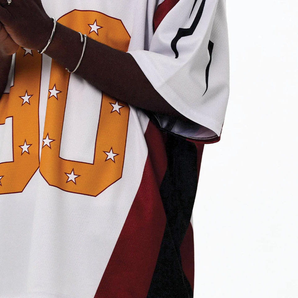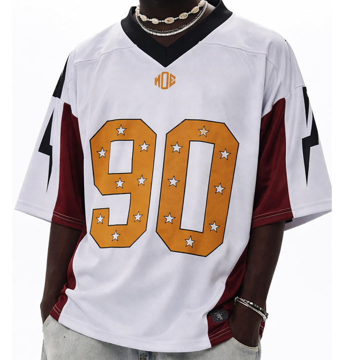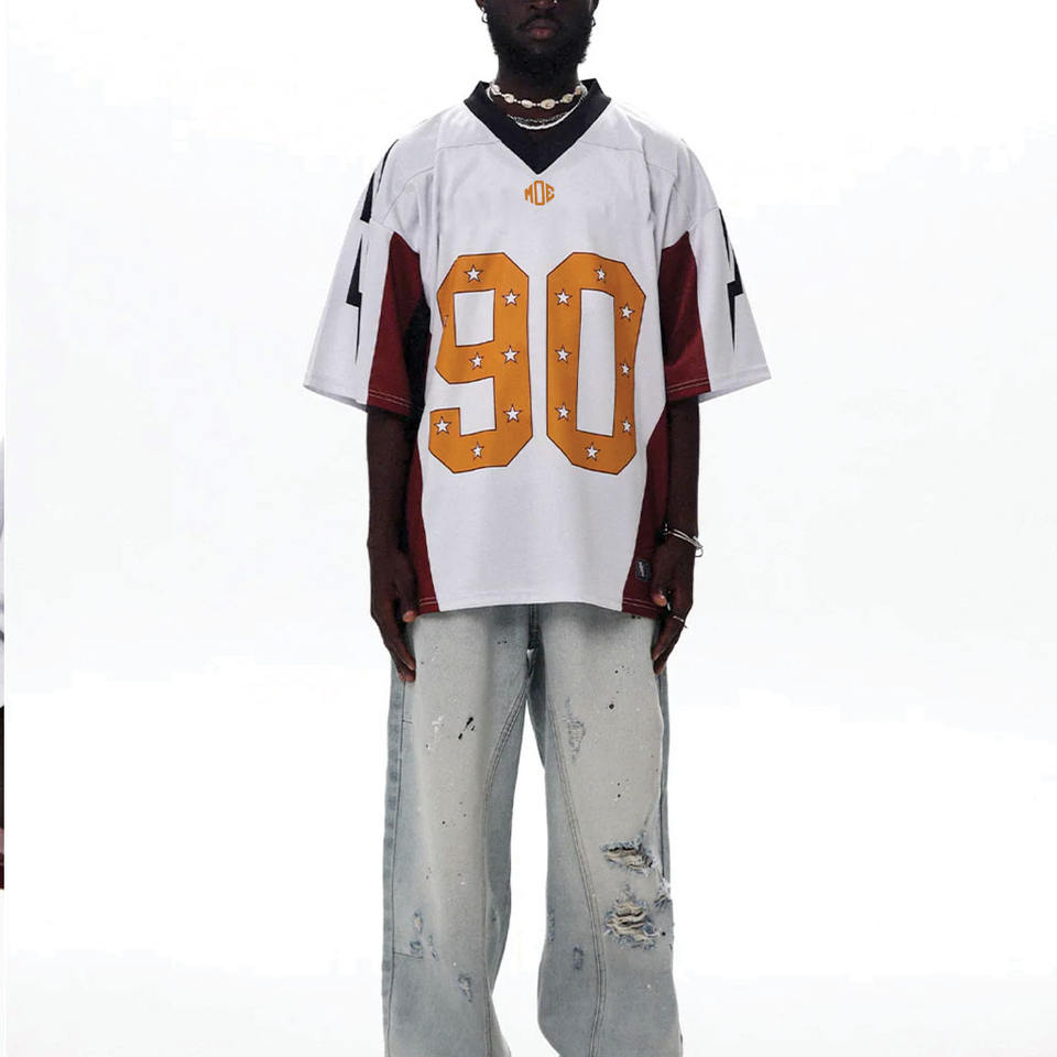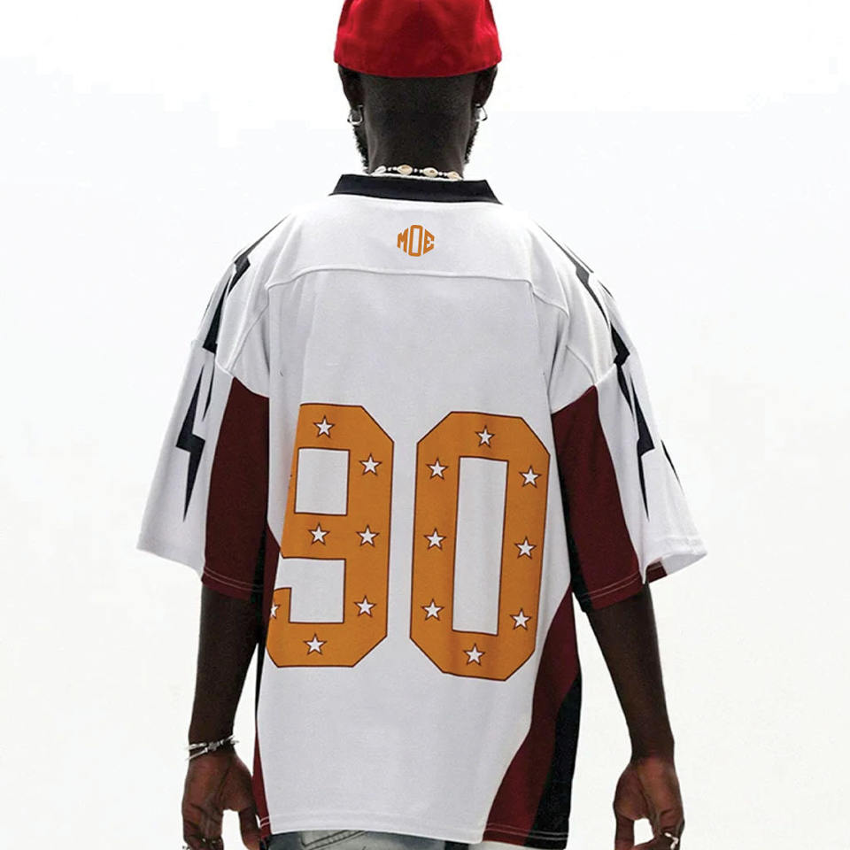 เสื้อเจอร์ซีย์อเมริกันฟุตบอลทรงโอเวอร์ไซส์สไตล์ Y2K สำหรับผู้ชาย ผลิตจากโพลีเอสเตอร์ ดีไซน์พิมพ์ลายแบบ Sublimation พร้อมหมายเลขและดาว รับผลิตตามแบบ OEM