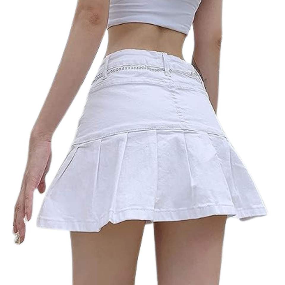 กระโปรงยีนส์สั้นสีขาวล้วนสไตล์ Y2K สำหรับผู้หญิง ออกแบบเองได้ ใส่หน้าร้อน เอวสูง จีบพลีท