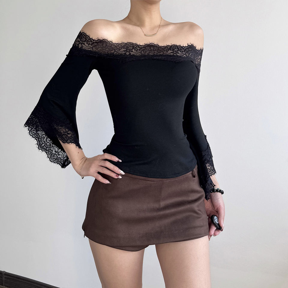 เสื้อยืดแขนยาวสไตล์ Y2K ตกแต่งลูกไม้ คอเฉียง แขนบาน สีพื้น ทรงเข้ารูป สวยสง่า