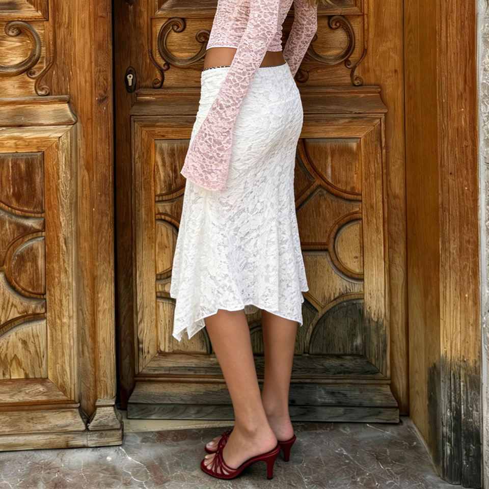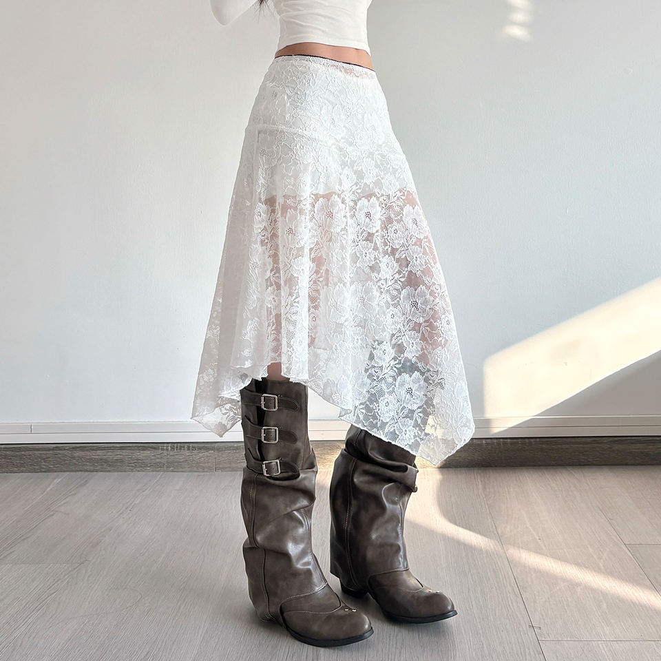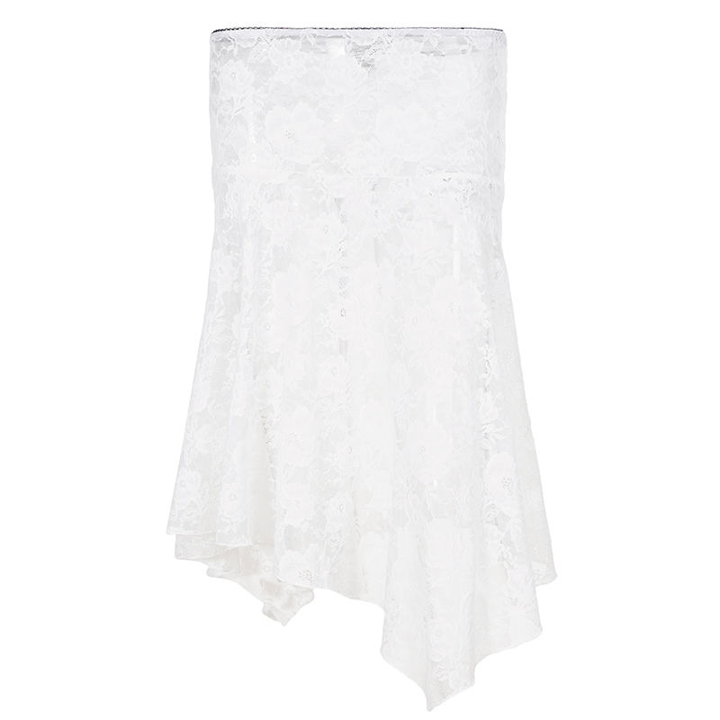 กระโปรงลูกไม้ซีทรูเอวต่ำทรงไม่สมมาตรสไตล์ Y2K แฟชั่นขายส่ง กระโปรงมินิเซ็กซี่แบบโปร่งใสไม่มีซับใน