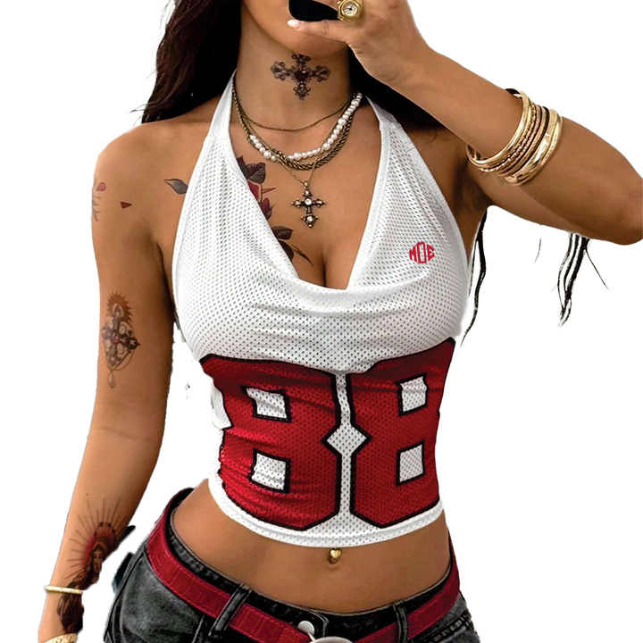 เสื้อครอปท็อปตาข่ายแบบผูกคอ สไตล์ Y2K สำหรับผู้หญิง พิมพ์ลายหมายเลขได้ตามสั่ง เสื้อแขนกุดแนวสตรีทแวร์ รับผลิตเสื้อผ้าสตรีแบบ OEM จำนวนมาก