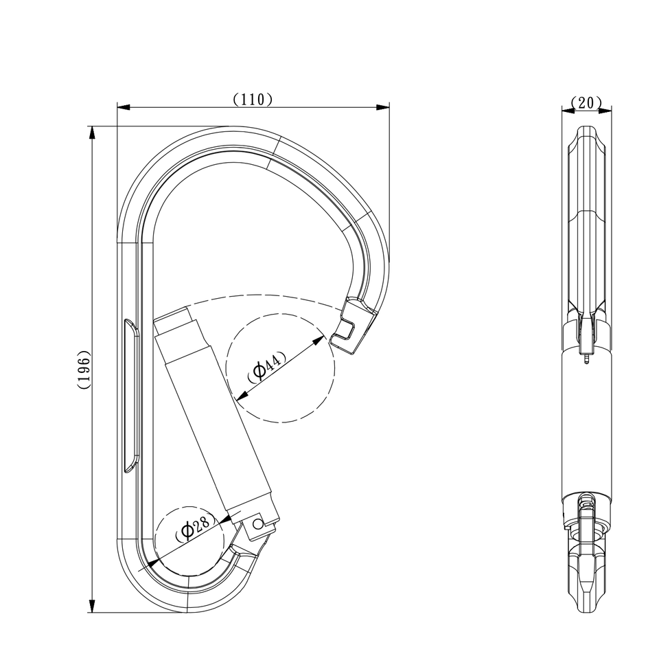 คาราไบเนอร์อะลูมิเนียมอัลลอยด์ชุบอโนไดซ์ YAC034D รูปทรงวงรี รับน้ำหนักได้ 22kN/4945LBS น้ำหนักเบา 209 กรัม ความยาว 196 มม. ความกว้าง 110 มม.