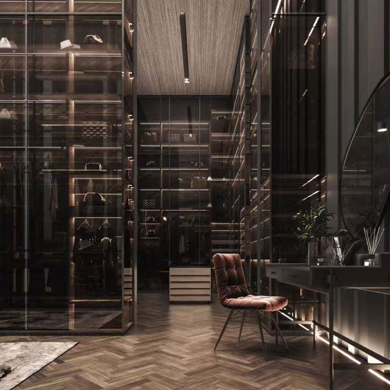 ตู้เก็บรองเท้าและเสื้อผ้าแบบบิวท์อิน ยี่ห้อ YALIG ผลิตจากไม้ HDF ผสมไม้จริง พร้อมบานกระจก ปรับแต่งได้หลากหลายฟังก์ชั่น