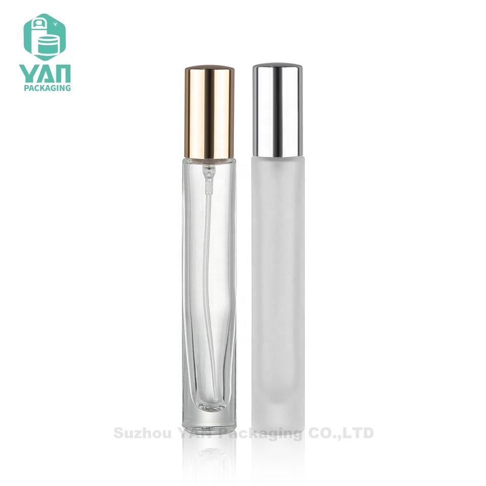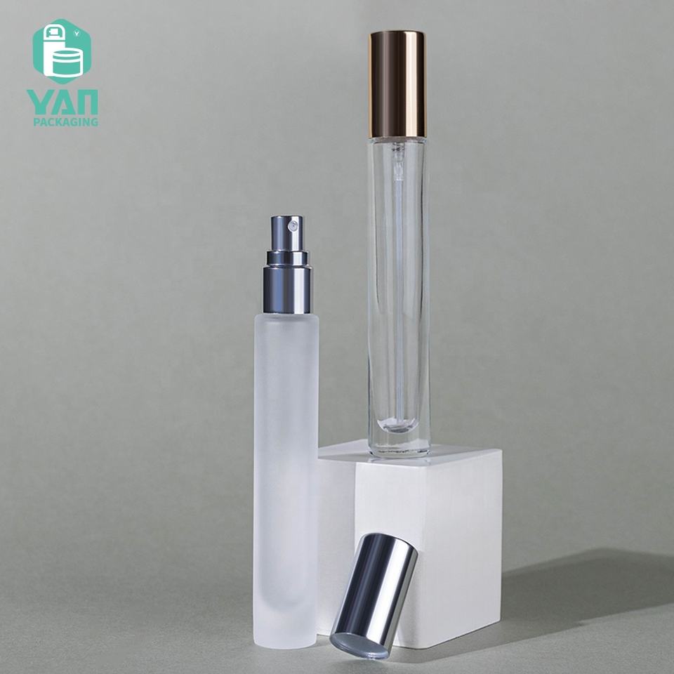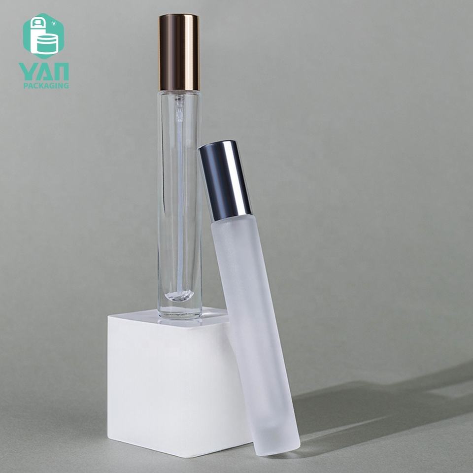 ขวดน้ำหอมแก้วพกพาแบบพ่น ขนาด 10 มล. ทรงกระบอกหนา ดีไซน์หรู ฝาอะลูมิเนียม แบบใสขุ่น ยี่ห้อ YAN Packaging ขายส่ง