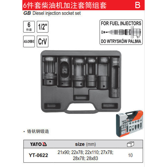 YATO Diesel Injection Socket Set 6-Piece 1/2 Inch CrV For Fuel Injectors YT-0622