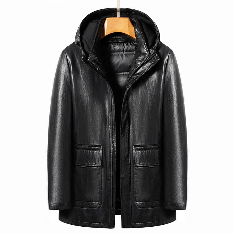 YN-2268 Men's High-Grade Down Jacket Winter White Duck Liner Hooded with Detachable Medium Long Natural Leather for Middle Aged